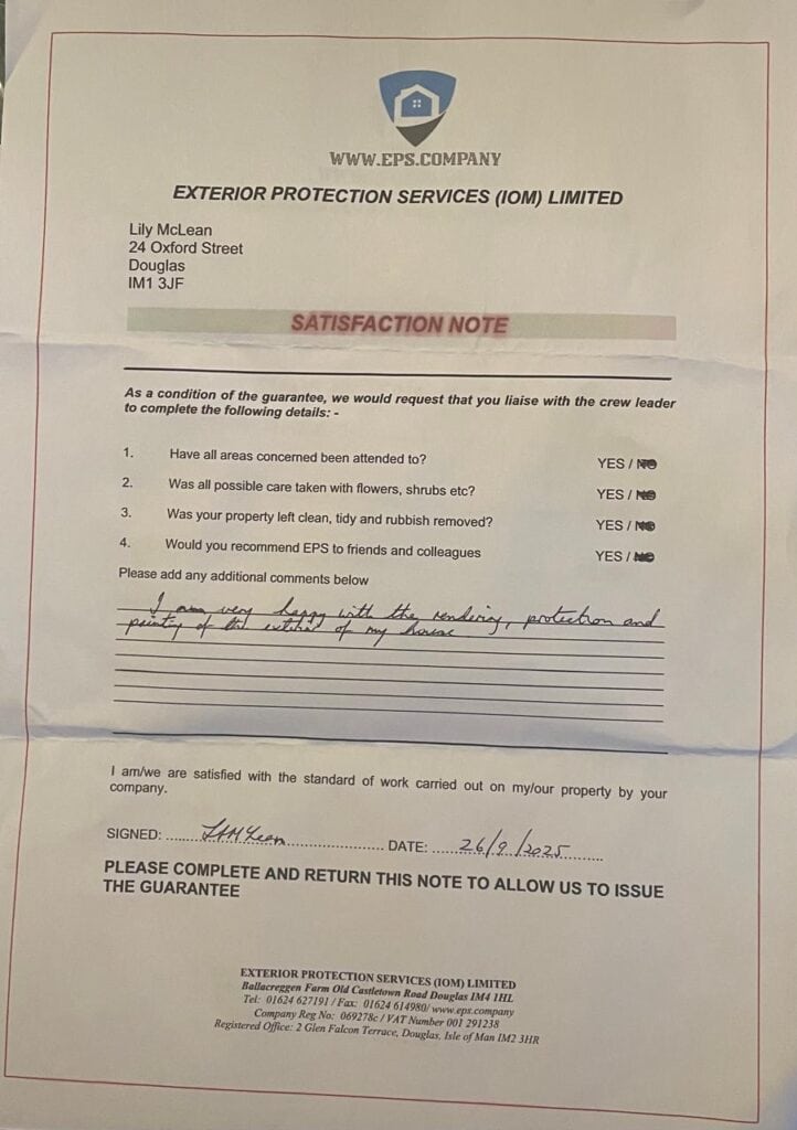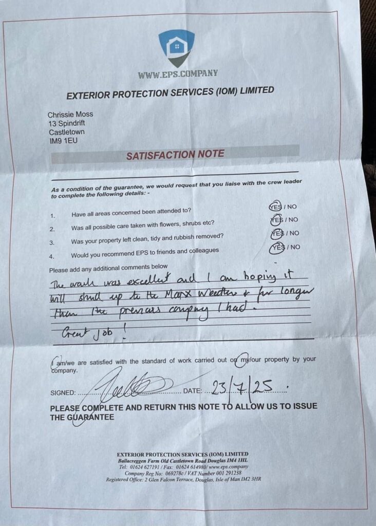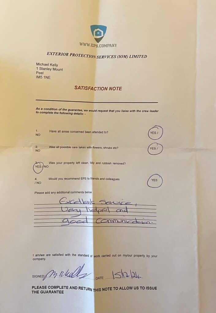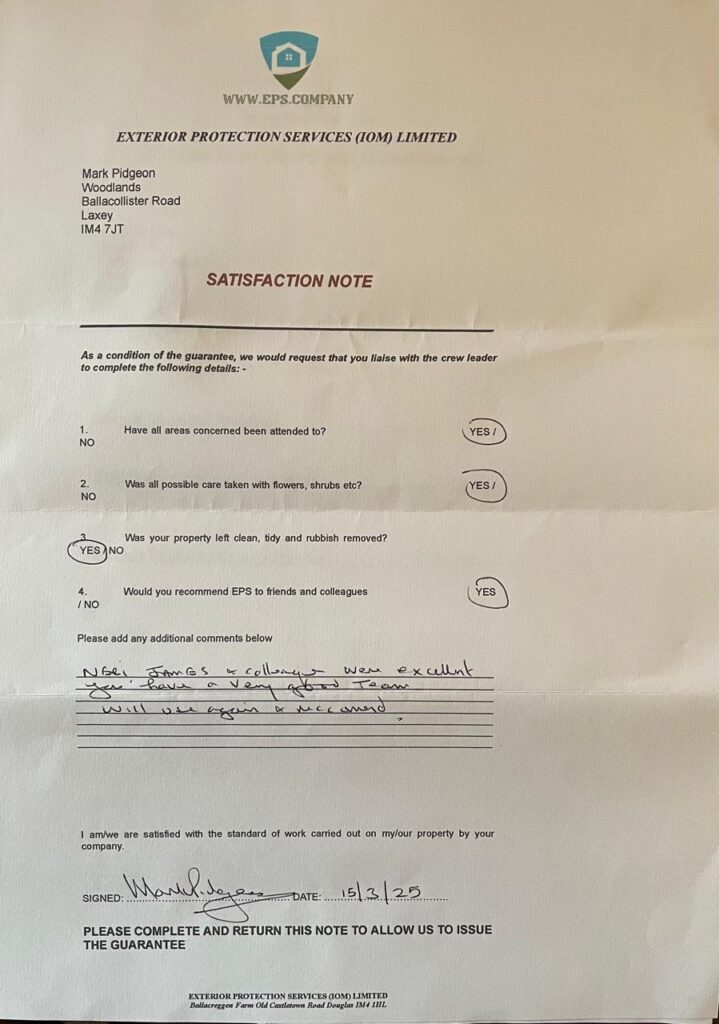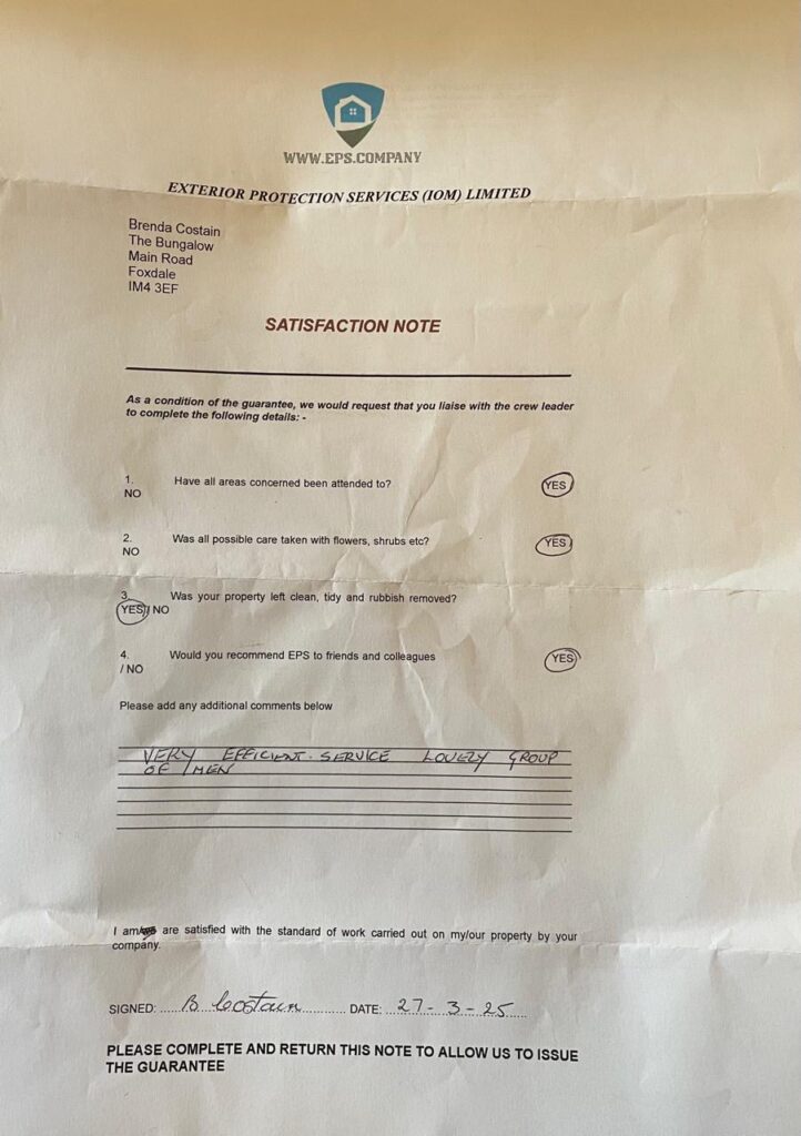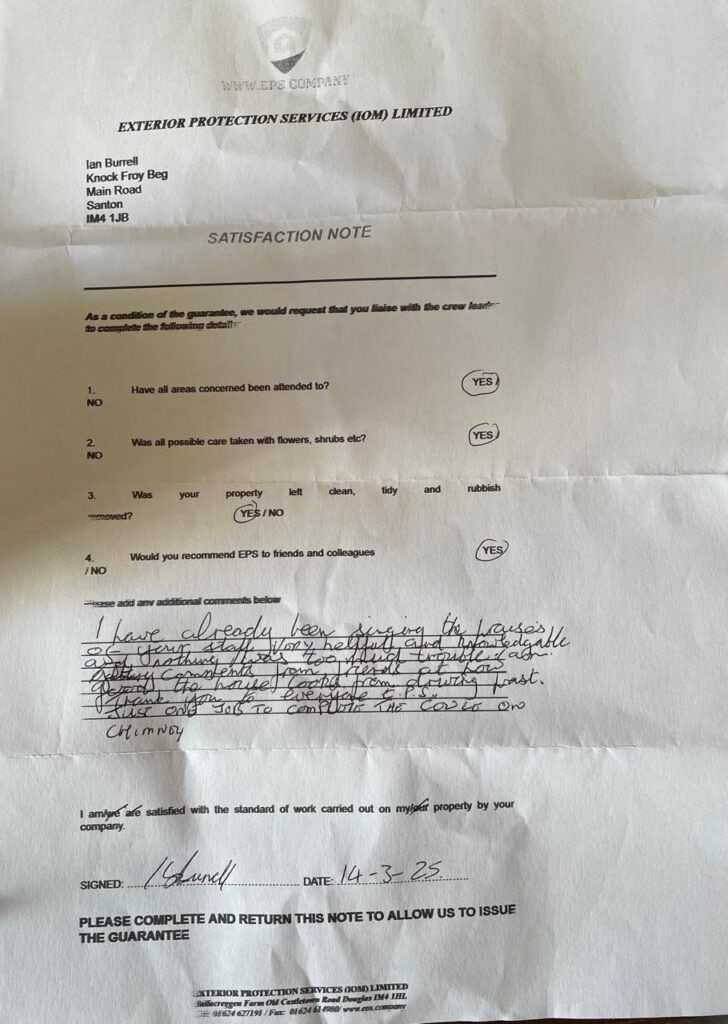 We are extremely satisfied with the work carried out by EPS IOM Ltd Under crew leader Nerry.